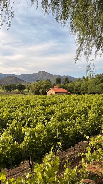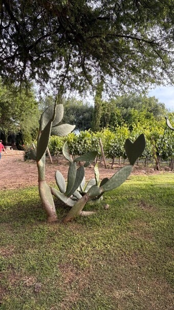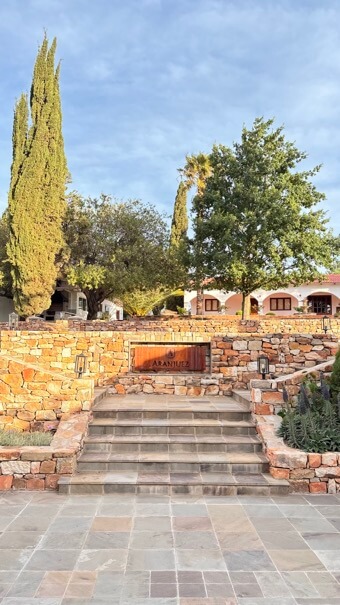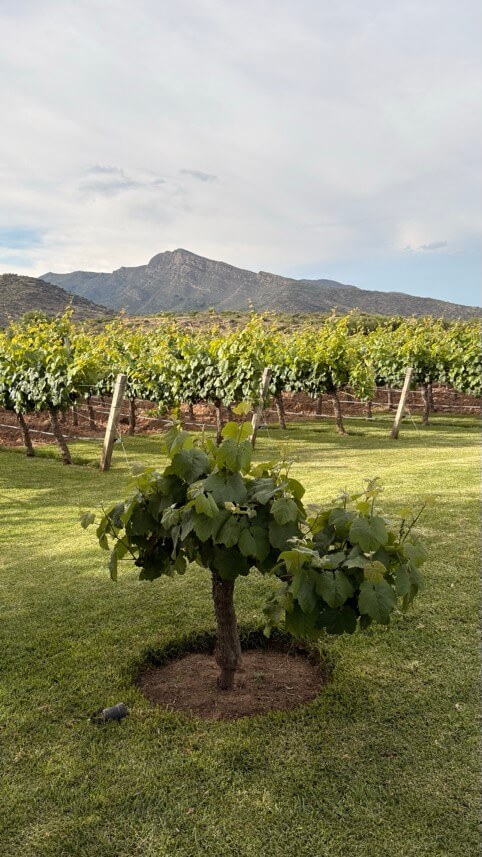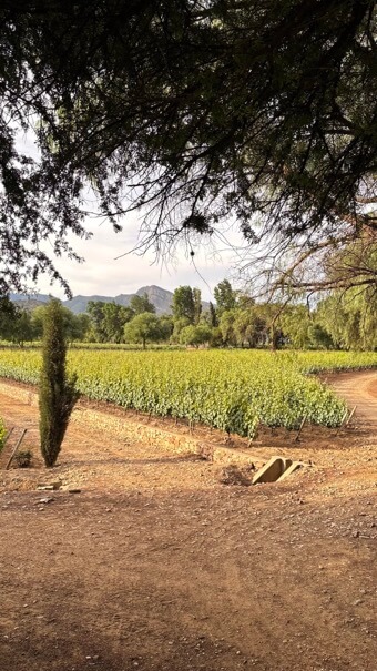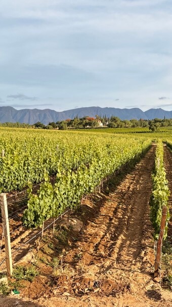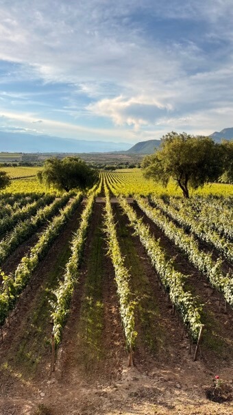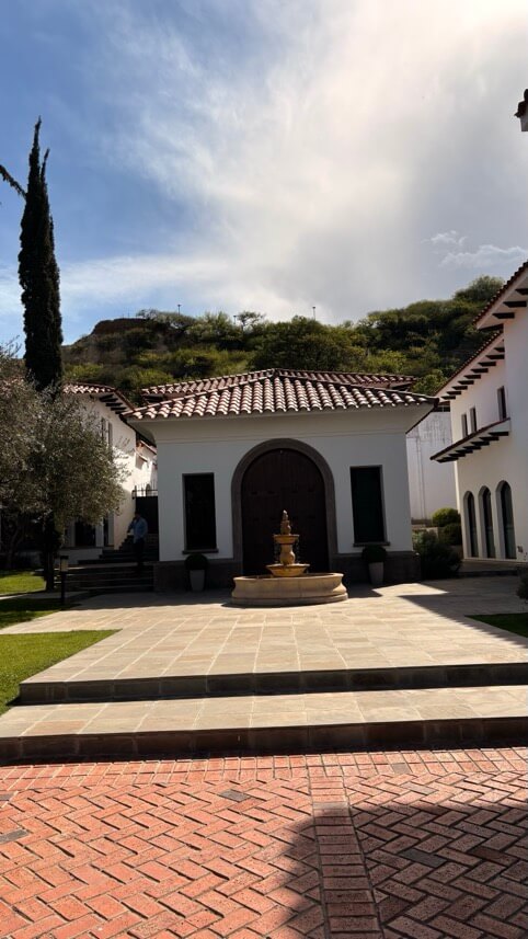 Après un trajet d’une vingtaine de minutes (18 km environ), nous arrivons à la Finca El Origen, le domaine viticole de la famille Castellanos. Le portail franchi, on découvre un vaste domaine entouré de vignes parfaitement alignées et de collines qui semblent onduler jusqu’à l’horizon. Les bâtiments, au style colonial élégant, se détachent sur un ciel d’un bleu éclatant. On pourrait presque se croire en Toscane — et pourtant, nous sommes bien en Bolivie !